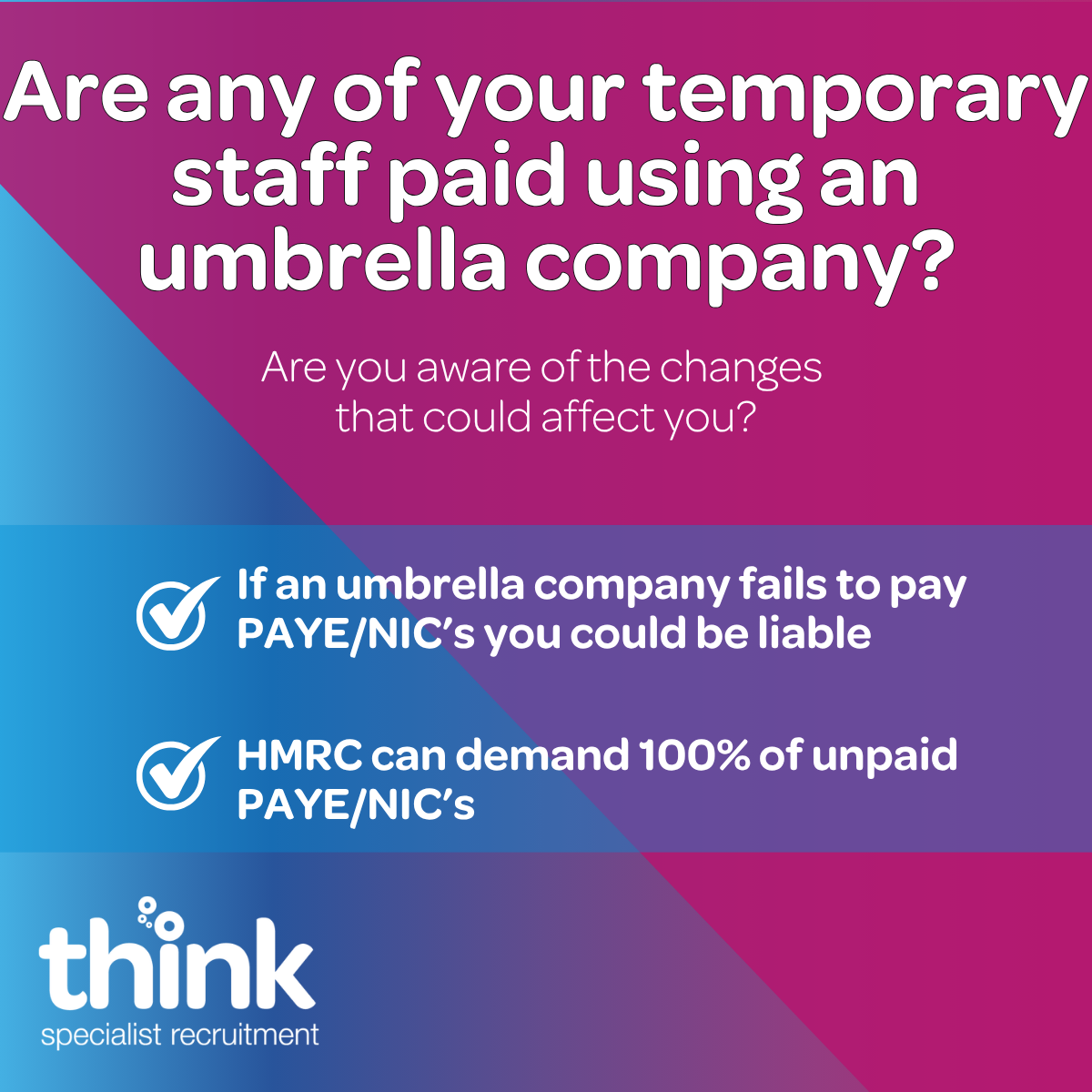 At Think Specialist Recruitment we don't use umbrella companies. Our focus has always been ensuring workers are paid fairly, compliantly and transparently removing the burden of calculating tax and NI contributions.